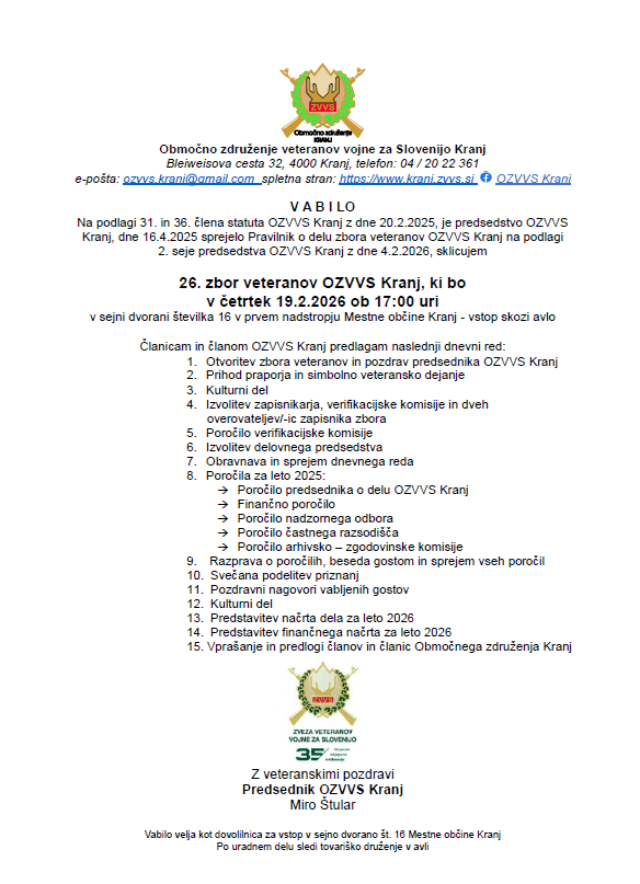 Vabilo za zbor veteranov OZVVS Kranj 19.2.2026